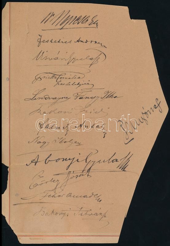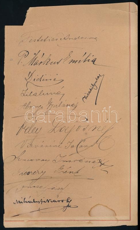 cca 1920 Oklevélrészlet számos híresség aláírásával Festetich Andor és felesége, Vízvári Gyula, Prielle Cornélia, Lendvayné Fácnsi Etelka, Rákosi Szidi, Törley József, Vízvári Mariska, Márkus Emilia, Zilahiné, Mihályfi Károly és még sokan mások. Három darabban.