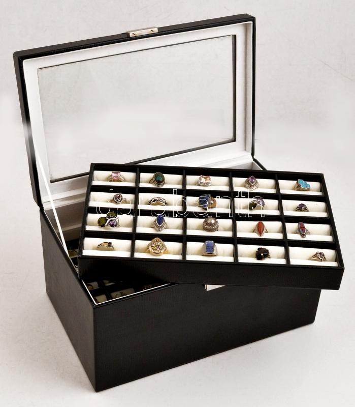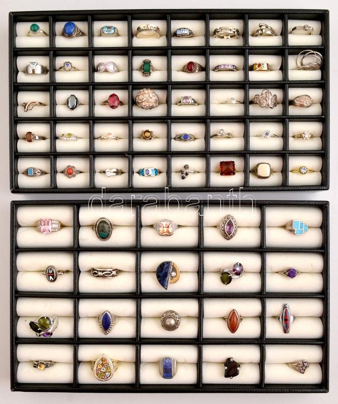 Beschreibung: 100 db-os ezüst ( Ag.) gyűrű gyűjtemény, különféle ásványokkal és szintetikus kövekkel, több jelzett, ékszertartó dobozban, 31×19 cm