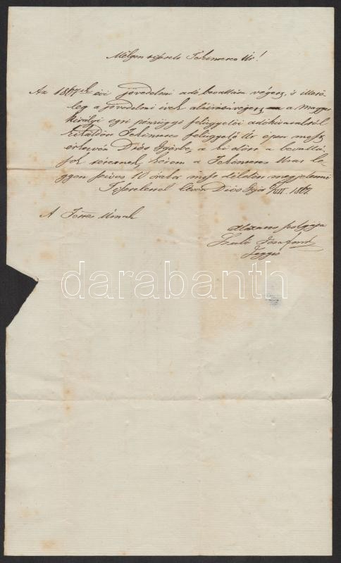 Beschreibung: 1867 Diósgyőr, Papírgyárnak címzett levél adóbevallás ügyben, viaszpecséttel, 35,5x21 cm