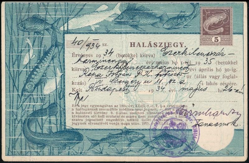 Beschreibung: 1934 Budapesti lakos számára kiállított halászjegy 5 P okmánybélyeggel / fishing ticket