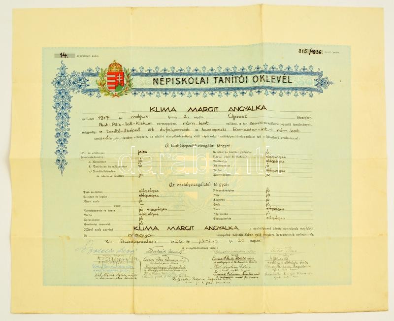 1936 Népiskolai tanítói oklevél, aláírásokkal, 42x49 cm https://www.darabanth.com/de/305-Fernauktion/305.0/Andere-Sammelgebiete/Dokument~300029/1936-Nepiskolai-tanitoi-oklevel-alairasokkal-42x49-cm~II1641317