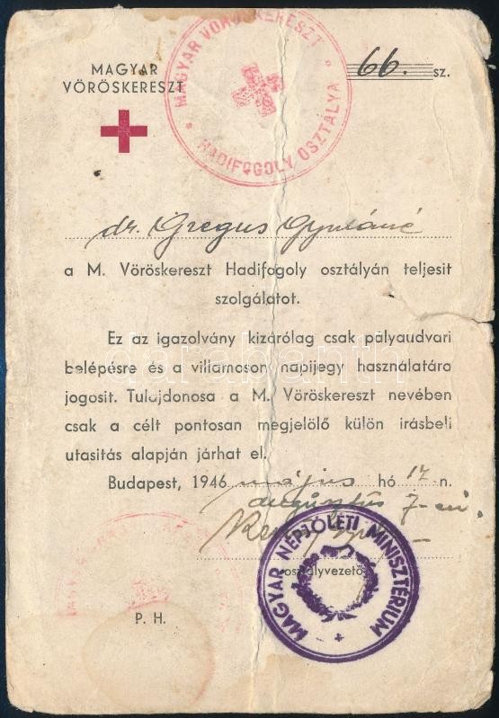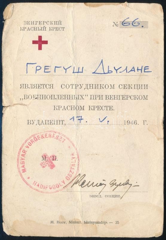 1946 Bp., A Magyar Vöröskereszt által kiállított igazolvány hadifogoly... https://www.darabanth.com/de/305-Fernauktion/305.0/Andere-Sammelgebiete/Dokument~300029/1946-Bp-A-Magyar-Voroskereszt-altal-kiallitott-igazolvany-hadifogoly-osztalyon-szolgalatot~II1649495