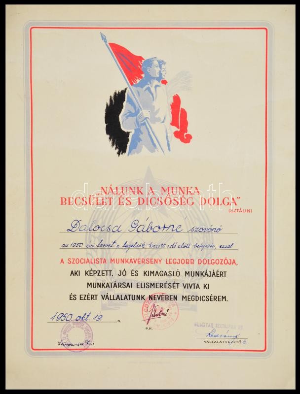 1950 Munkaverseny-díszoklevél szövőnő részére https://www.darabanth.com/de/305-Fernauktion/305.0/Andere-Sammelgebiete/Dokument~300029/1950-Munkaverseny-diszoklevel-szovono-reszere~II1647718