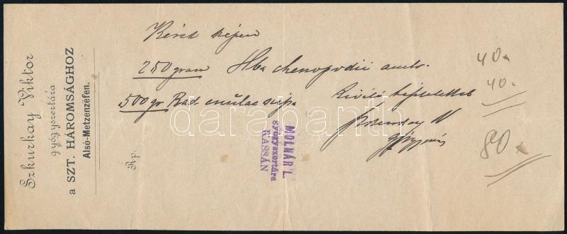 Beschreibung: cca 1900 Alsó-Metzenzéf, Szkurkay Viktor gyógyszertárész alapanyag kérő sorai saját receptpapírján egy kassai gyógyszertárhoz