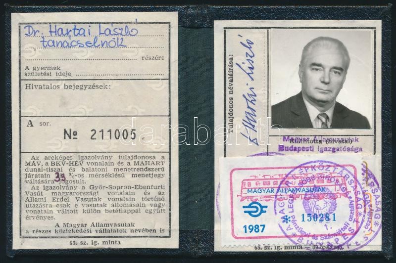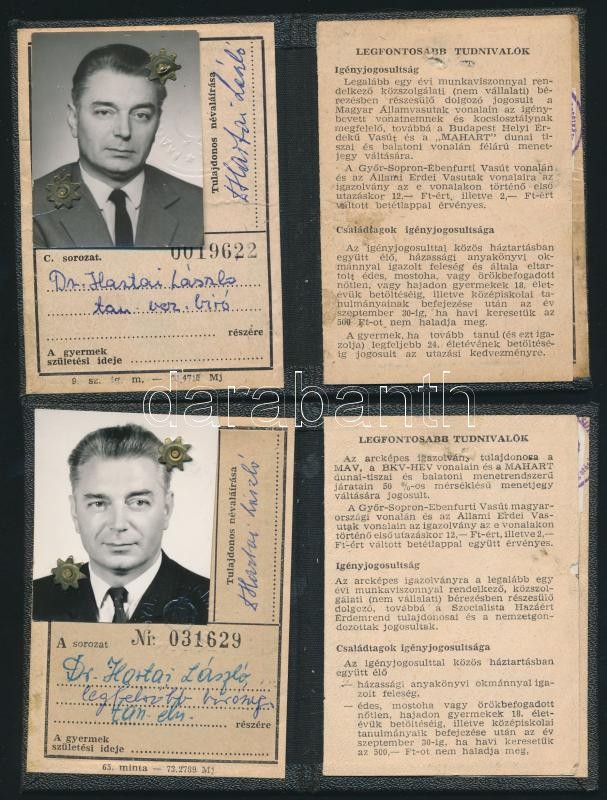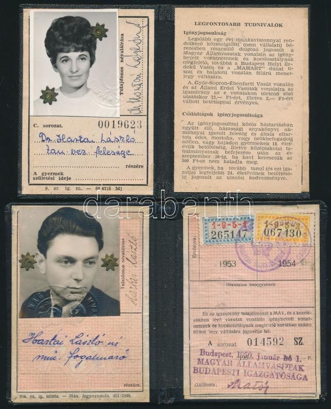 Beschreibung: cca 1951-1987 Hartai László (1925-1987) a Legfelsőbb Bíróság tanácselnökének és feleségének 4 db kedvezményes vasúti igazolványa