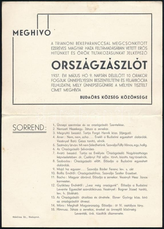 1937 Meghívó budaörsi országzászló avatására programmal https://www.darabanth.com/de/305-Fernauktion/305.0/Andere-Sammelgebiete/Drucksachen~300027/1937-Meghivo-budaorsi-orszagzaszlo-avatasara-programmal~II1645954