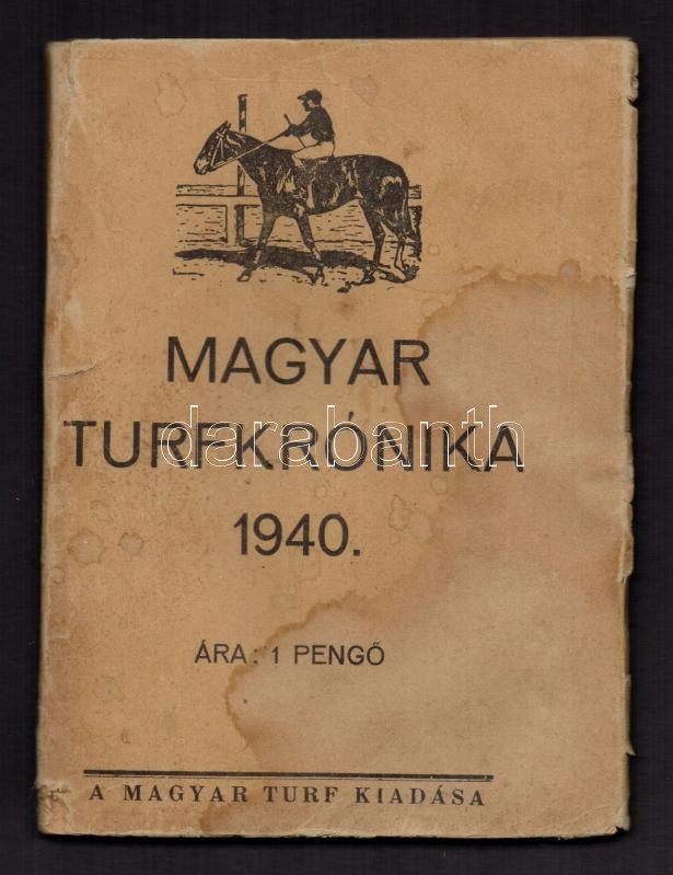 1940 Magyar Turfkrónika. Szerk.: Őszi Kornél. (Bp.), Magyar Turf, 138 p. Kiadói papírborítóban, foltos, a címlap hiányzik, az első oldal szakadt. 1940-es év lóverseny eredményei.
