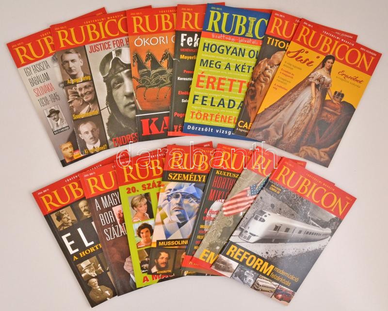 2002-2008 a Rubicon történelmi folyóirat lapszámai, két teljes (2006/1-10, 2007/1-10) és két hiányos évfolyam (2005/7-10, 2008/1-8), valamint további lapszámok: 2002/11-12, 2003/6, illetve különszámok: 2006/1, 2007/2, 2008/1; számos érdekes, aktuális témát feszegető írással, jó állapotban