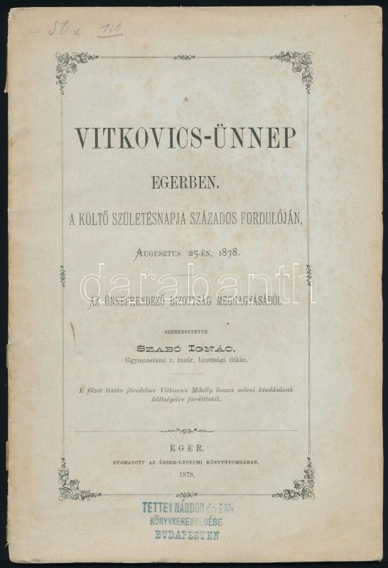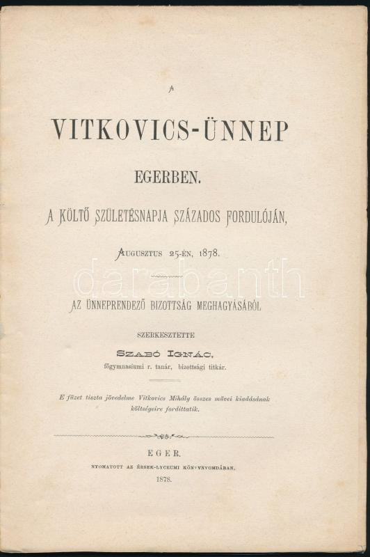Szabó Ignác (szerk.): A Vitkovics-ünnep Egerben. Eger, 1878. Érseki Ly... https://www.darabanth.com/de/305-Fernauktion/305.0/Andere-Sammelgebiete/Drucksachen~300027/Szabo-Ignac-szerk-A-Vitkovics-unnep-Egerben-Eger-1878-Erseki-Lyceum-48p-Fuzve-kiadoi-~II1650103