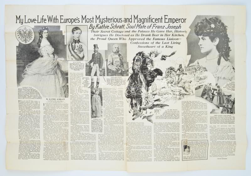 cca 1930 Angol nyelvű újságcikk Schratt Katalinról, Ferenc József szeretőjéről, képekkel, illusztrációkkal, hajtásnál szakadások, 55x80 cm / Article about Katharina Schratt confidante of Emperor Franz Joseph, 55x80 cm