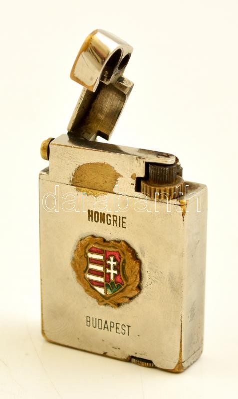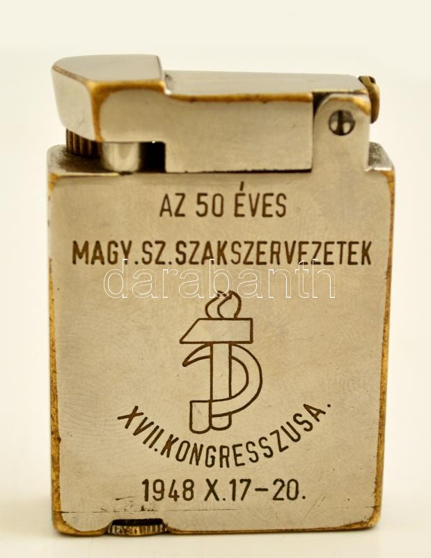 Beschreibung: 1948 Magyar Szakszervezetek XVII. Kongersszusa feliratos, Kossuth-címerrel díszített Gamma öngyújtó, fém, jelzett, m: 5 cm
