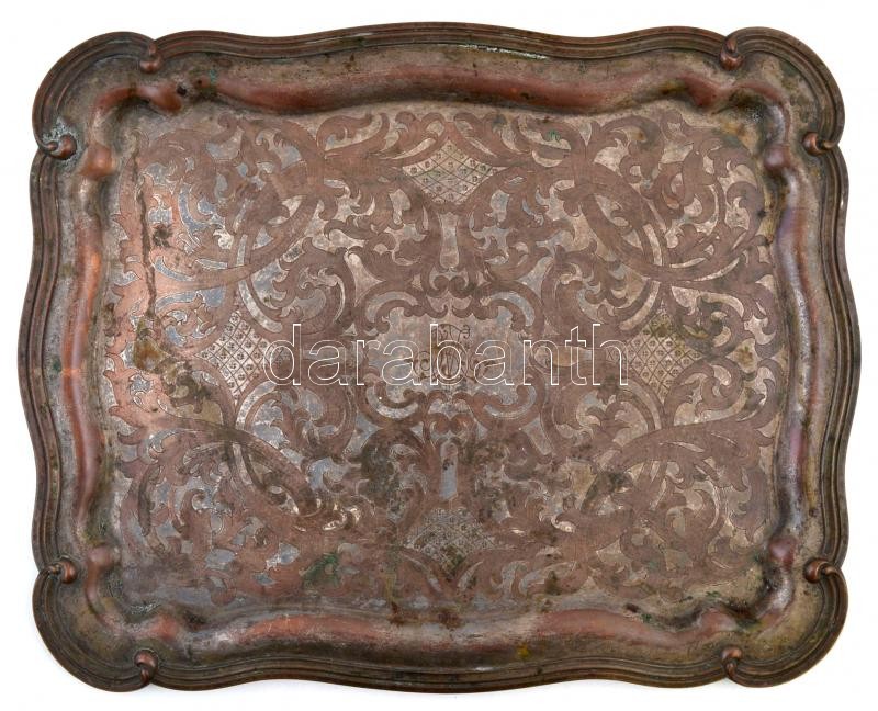 Beschreibung: Dekoratív fém tálca, gravírozott díszítéssel, 29x37 cm