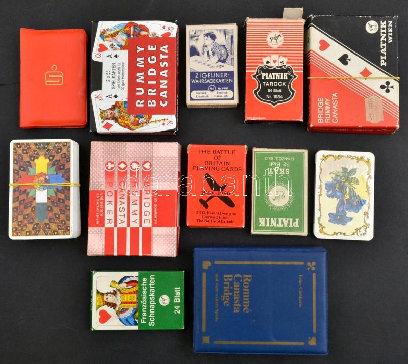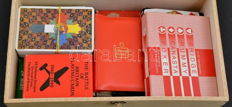 Érdekes kártya tétel, fa dobozban (többségében Piatnik, 54 lapos tarokk, 80 lapos jóskártya, angol repülőgéptípusokat bemutató kártya, stb.), doboz mérete: 29x17x9 cm