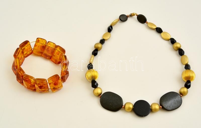 Beschreibung: Fekete-arany bizsu nyaklánc, borostyán karkötővel, 2 db
