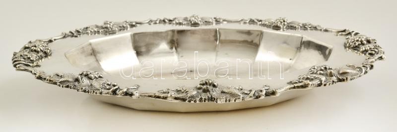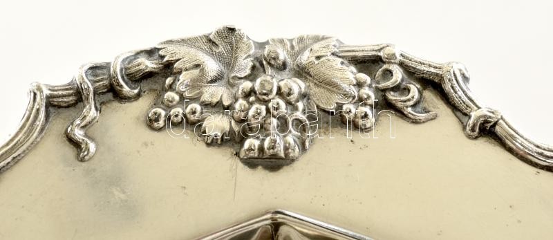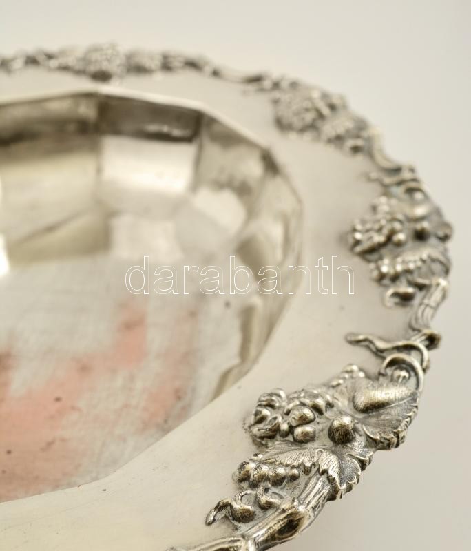 Beschreibung: Jelzett ezüstözött alpakka tál, plasztikus szőlőfürtökkel, 34×26 cm