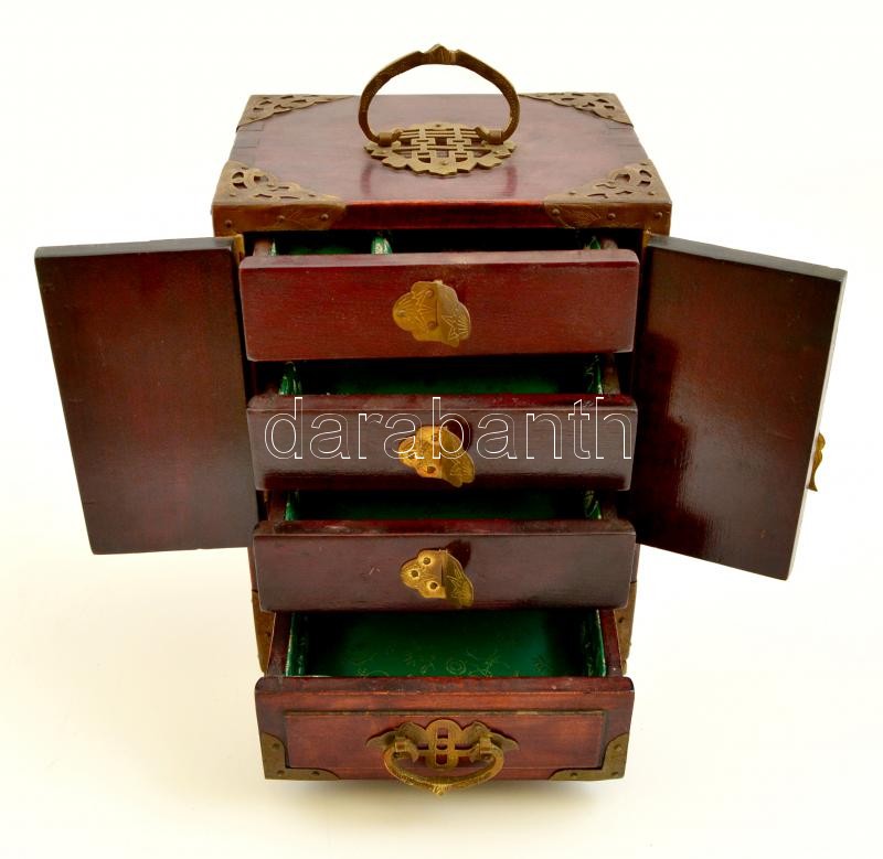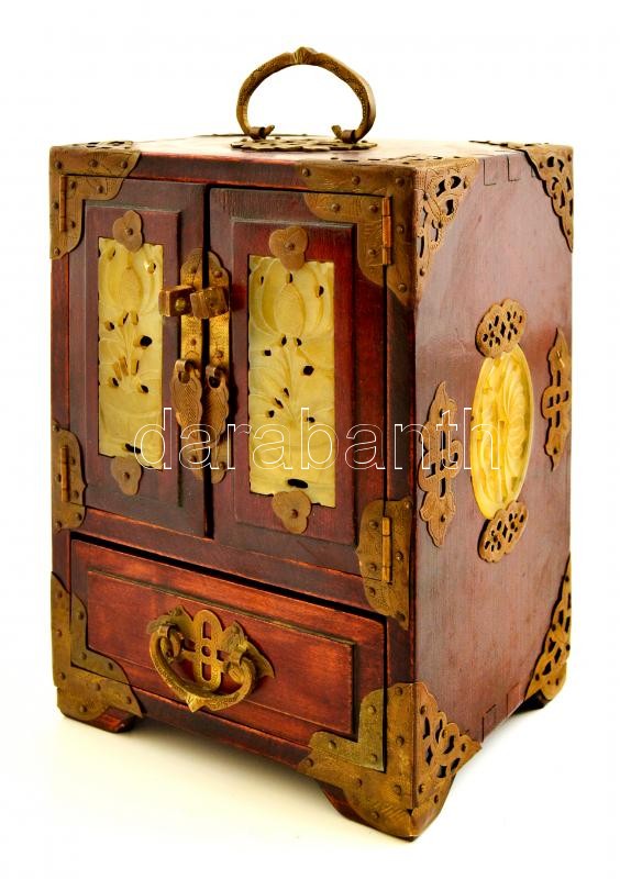 Beschreibung: Kínai ékszertartó mini szekrény, fa-szaru, jó állapotban, réz szerelékekkel,15×12 cm, m:21 cm