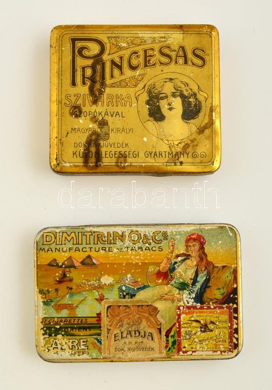 Beschreibung: Pricesas és Dimitrino fém cigarettás doboz, kopásnyomokkal, 8x9x2 és 7x11x2 cm