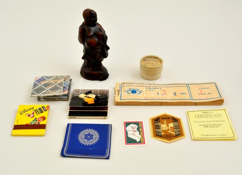 Beschreibung: Vegyes bolha tétel, összesen 10 db, közte műgyanta Buddha szobrocska, Malév ajándéktárgy, papír gyógyszeres doboz, gyufásdobozok, jegytömb