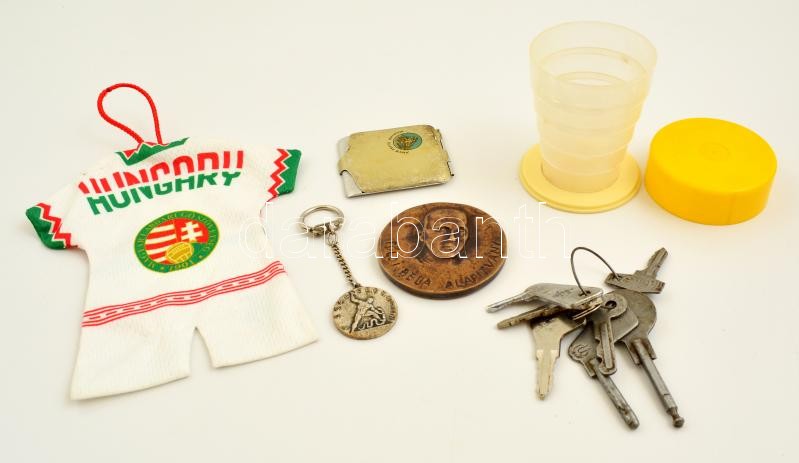 Vegyes bolha tétel, összesen 11 db, közte kulcsok, Magyar Labdarúgó Szövetség ajándéktárgy, plakett, kulcstartó, fém gyufatartó, retró kihajtható pohár