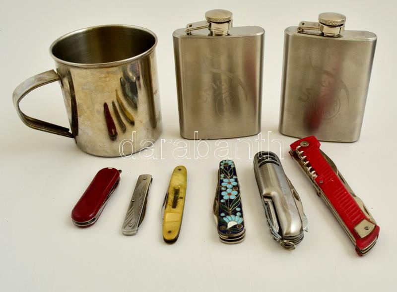 Beschreibung: Vegyes bolha tétel, összesen 9 db: 6 db bicska, 2 db fém flaska Unicum gravírozással, fém bögre