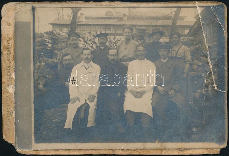 1918 Rzhev, Orosz hadifogolytáborban készült fénykép kórházi dolgozókról, hátoldalon érdekes részletekkel (pl. osztrák hadifogoly a kórház főorvosa), felületén sérülésekkel, 9x13 cm