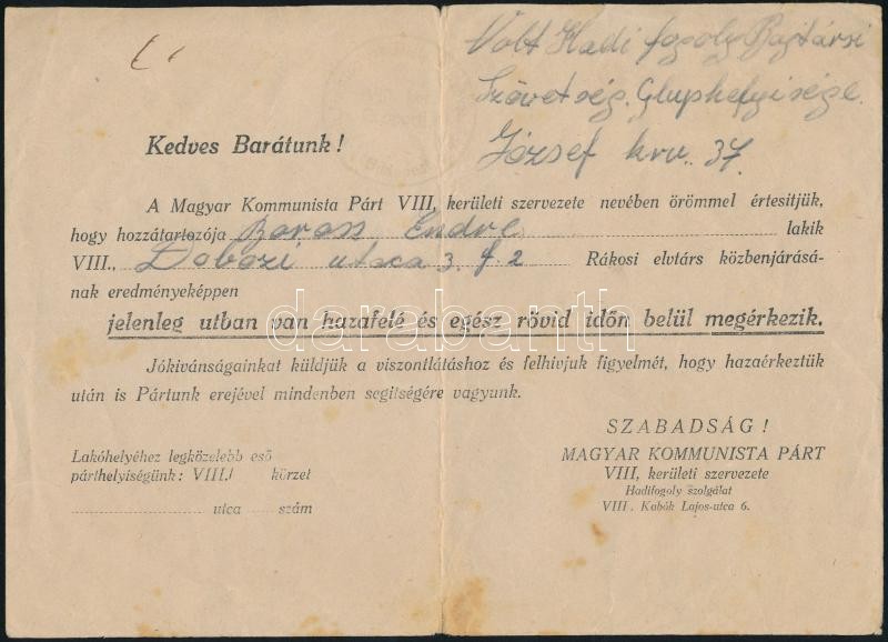 Beschreibung: 1945 A Magyar Kommunista Párt kitöltött nyomtatványa, melyben Rákosi elvtárs közbenjárására kiszabadított hadifogoly hazatéréséről értesíti a családot