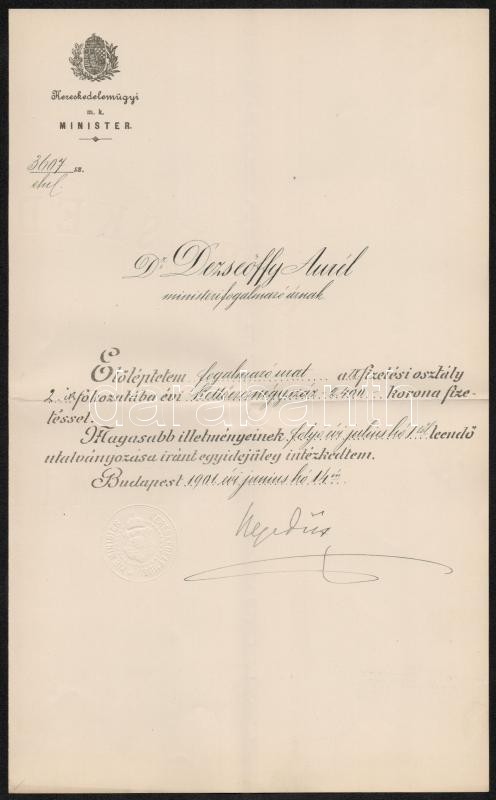 1899 Előléptetési okmány Dezseöffy Aurél részére Hegedüs Sándor keresk... https://www.darabanth.com/de/305-Fernauktion/305.0/Andere-Sammelgebiete/Signatur~300018/1899-Eloleptetesi-okmany-Dezseoffy-Aurel-reszere-Hegedus-Sandor-kereskedelemugyi-miniszte~II1607777