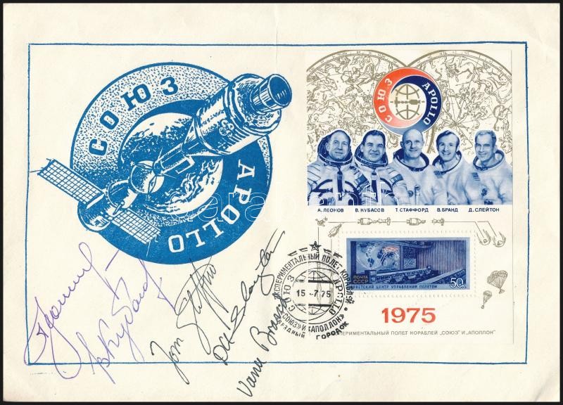 1975 A Szojuz-Apollo program résztvevőinek aláírásai emlékborítékon: Alekszej Leonov (1934- ), Valerij Kubaszov (1935-2014), Thomas P. Stafford (1930- ), Vance D. Brand (1931- ) és Deke Slayton (1924-1993) /