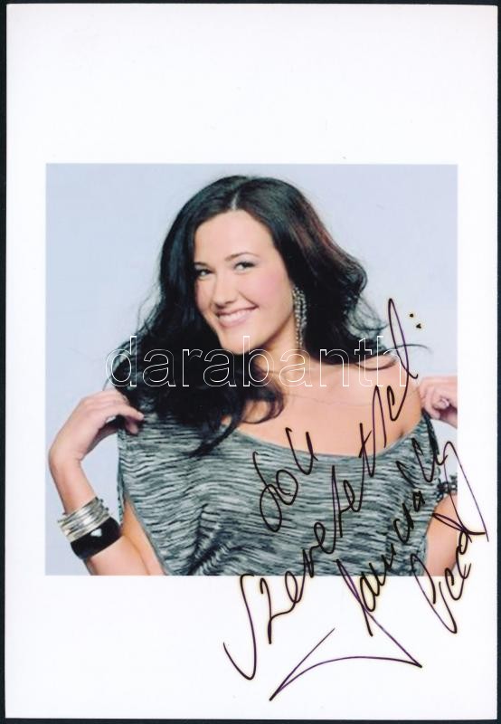 Beschreibung: Janicsák Veca (1989-) énekesnő aláírása az őt ábrázoló képen