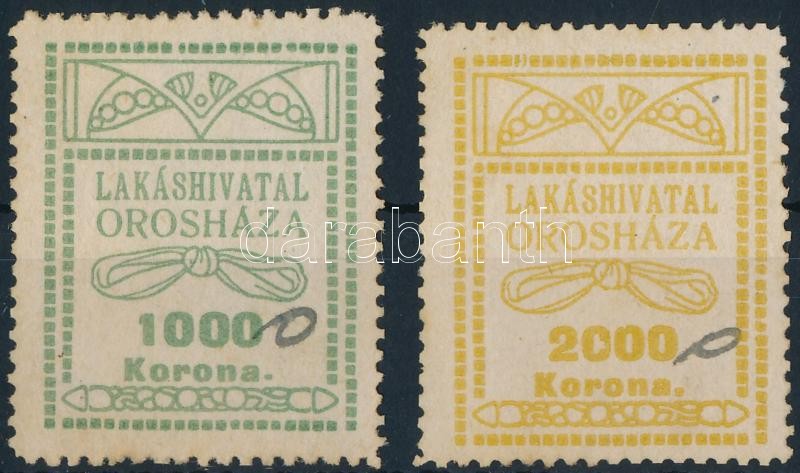 Beschreibung: 1925 Orosháza Lakáshivatal illetékbélyeg sor fekete tintával 0 hozzáadásával 10.000/1000K és 20.000/2000K átértékelve