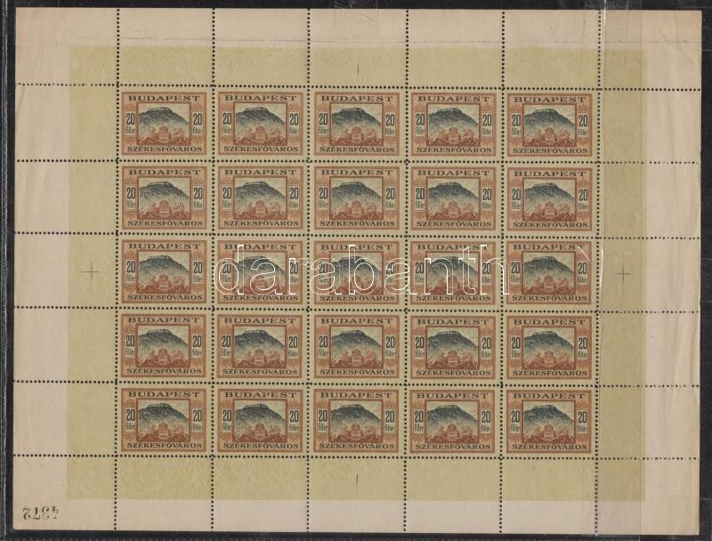 Beschreibung: 1927 Budapest Székesfőváros 20f okmánybélyeg teljes ív, 4372 sorszámmal