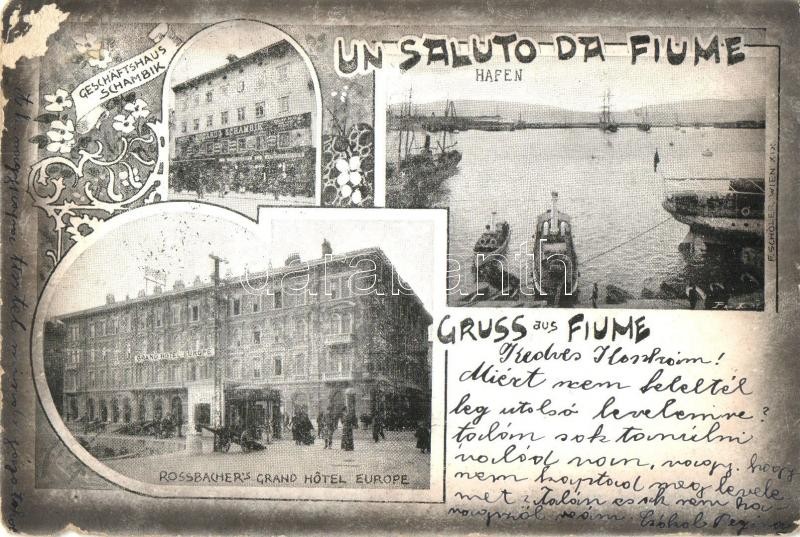 Beschreibung: Fiume, Edoardo Schambik üzlete, Rossbacher Europa Nagyszállója, kikötő / Hafen, Geschäftshaus, Hotel / port, shop, hotel, Art Nouveau (EB)