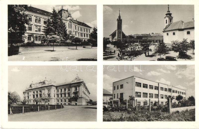 Beschreibung: Rimaszombat, Rimavská Sobota; Főgimnázium, Horthy Miklós tér, Vármegyeház, Mezőgazdasági iskola / grammar school, square, county hall, agricultural school