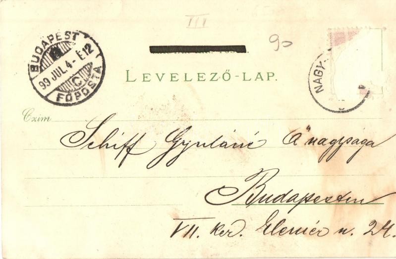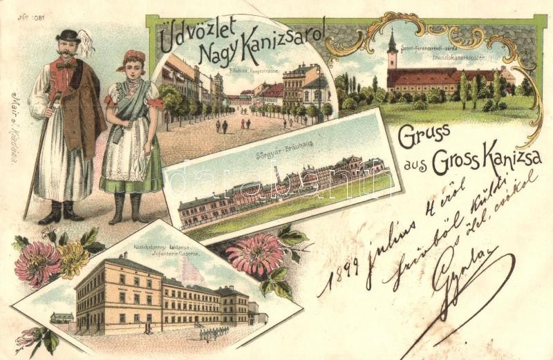 Beschreibung: 1899 Nagykanizsa, Fő utca, Szent Ferenc-rendi zárda, Sörgyár, Közöshadseregi laktanya, folklór. Mair J. kiadása, floral Art Nouveau litho (EB)
