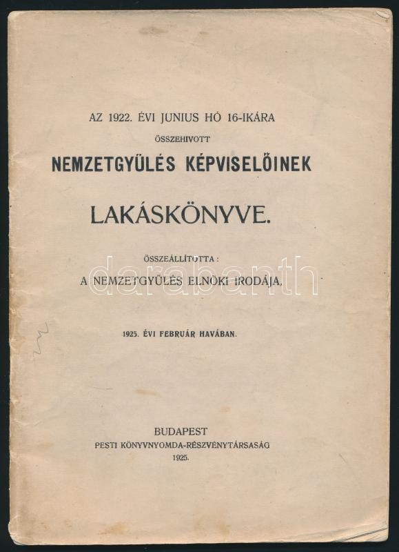 1925 Az 1922. évi június h 16-ikára összehívott Nemzetgyűlés képviselő... https://www.darabanth.com/de/306-Fernauktion/306.0/Andere-Sammelgebiete/Drucksachen~100030/1925-Az-1922-evi-junius-h-16-ikara-osszehivott-Nemzetgyules-kepviseloinek-lakaskonyve-4~II1651770