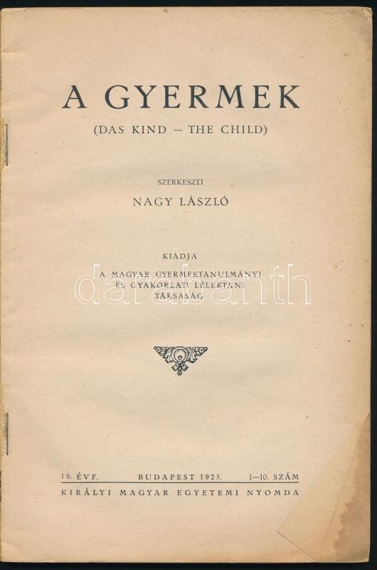 1926 A gyermek. (Das Kind - The child.) Szerk.: Nagy László. Kiadja a Magyar Gyermektanulmányi és Gyakorlati Lélektani Társaság. 18. évfolyam 9-10. szám. Bp., Kir. Magyar Egyetemi Nyomda. Papírkötésben, foltos.