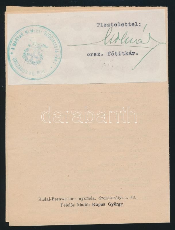 1938 Magyar Nemzetiszocialista Párt Szálasi ismertető füzet 4p. Hátold... https://www.darabanth.com/de/306-Fernauktion/306.0/Andere-Sammelgebiete/Drucksachen~100030/1938-Magyar-Nemzetiszocialista-Part-Szalasi-ismerteto-fuzet-4p-Hatoldalan-a-titkar-sajat-ke~II1656417