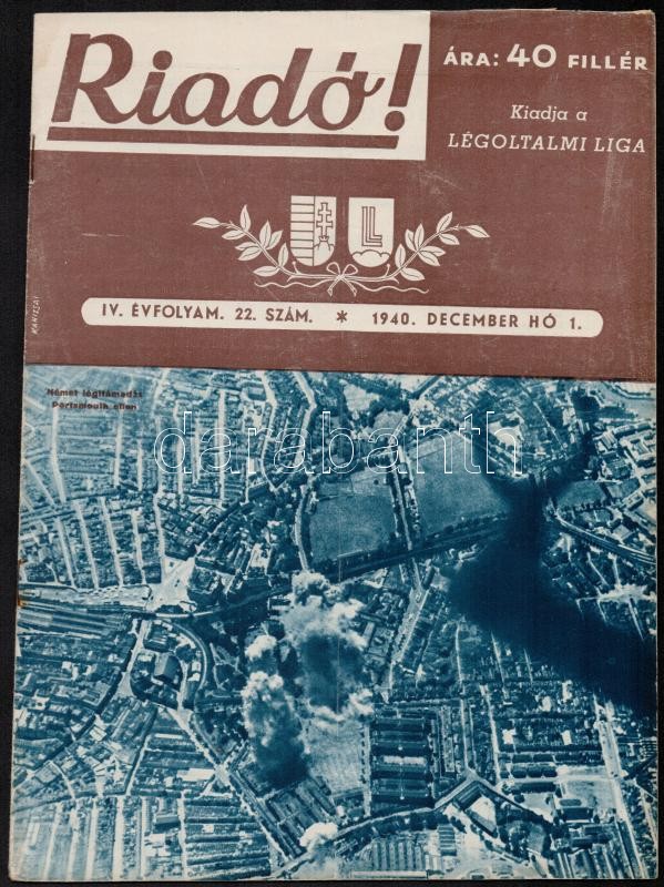 1940 A Riadó! a Légoltalmi Liga lapja IV. évfolyamának 22. száma https://www.darabanth.com/de/306-Fernauktion/306.0/Andere-Sammelgebiete/Drucksachen~100030/1940-A-Riado-a-Legoltalmi-Liga-lapja-IV-evfolyamanak-22-szama~II1653166