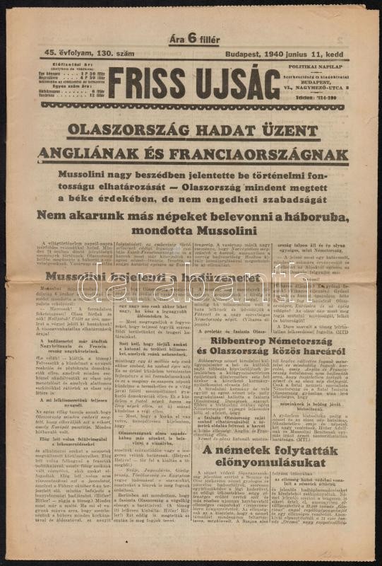 1940 Bp., A Friss Újság 45. évfolyamának 130. száma, háborús hírekkel https://www.darabanth.com/de/306-Fernauktion/306.0/Andere-Sammelgebiete/Drucksachen~100030/1940-Bp-A-Friss-Ujsag-45-evfolyamanak-130-szama-haborus-hirekkel~II1652994