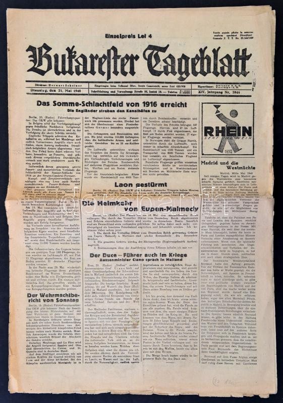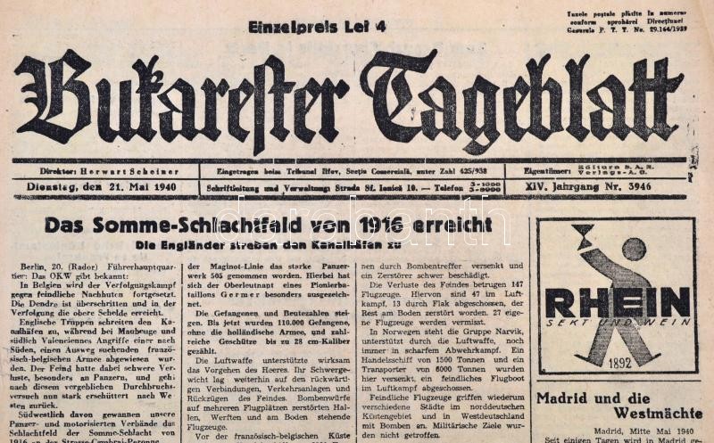 1940 Bukarester Tageblatt XIV. évfolyamának 3946. száma, háborús hírek... https://www.darabanth.com/de/306-Fernauktion/306.0/Andere-Sammelgebiete/Drucksachen~100030/1940-Bukarester-Tageblatt-XIV-evfolyamanak-3946-szama-haborus-hirekkel~II1653132