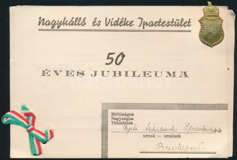 1941 Nagykálló és Vidéke Ipartestület meghívó 50 éves jubileumra, fém ... https://www.darabanth.com/de/306-Fernauktion/306.0/Andere-Sammelgebiete/Drucksachen~100030/1941-Nagykallo-es-Videke-Ipartestulet-meghivo-50-eves-jubileumra-fem-cimerrel-11x16-cm~II1651039
