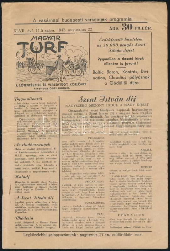 1942 Magyar Turf, a lótenyésztés és versenyügy közlönye XLVII. évfolya... https://www.darabanth.com/de/306-Fernauktion/306.0/Andere-Sammelgebiete/Drucksachen~100030/1942-Magyar-Turf-a-lotenyesztes-es-versenyugy-kozlonye-XLVII-evfolyam-115-szam~II1654610