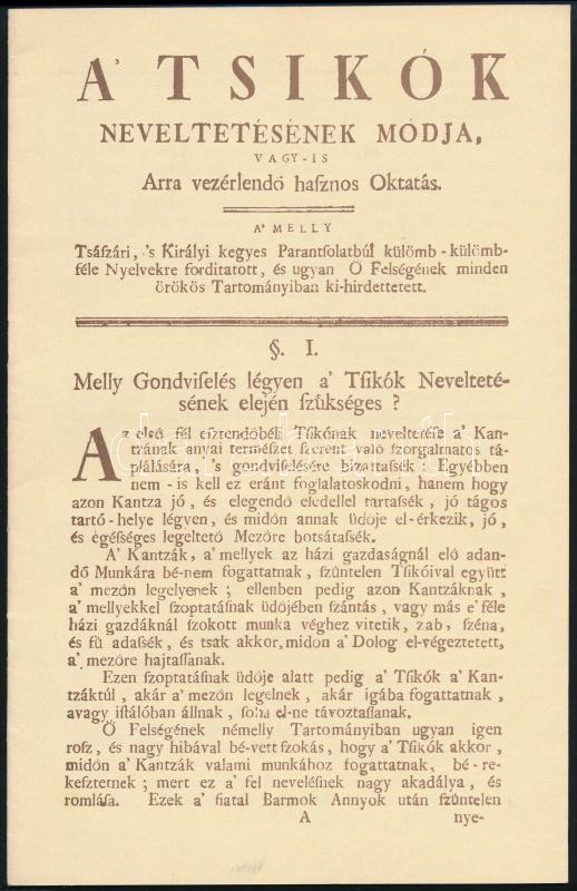 Beschreibung: 1989 A' tsikók neveltetésének modja, vagy-is arra vezérlendő hasznos oktatás. h.n.,1989, Agroinform. Papírkötés, 5 sztl. lev. Reprint.