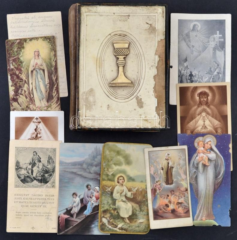 Vegyes papírrégiség tétel, vallási témában, 11 db, 9 db szentkép, változó állapotban, különféle méretben, valamint egy 1912-es egyházi énekeskönyv, rossz állapotban.