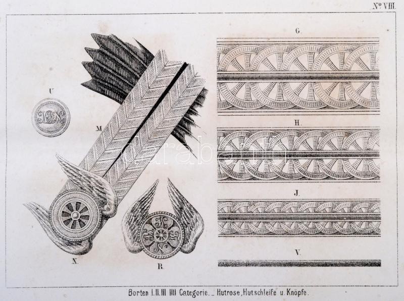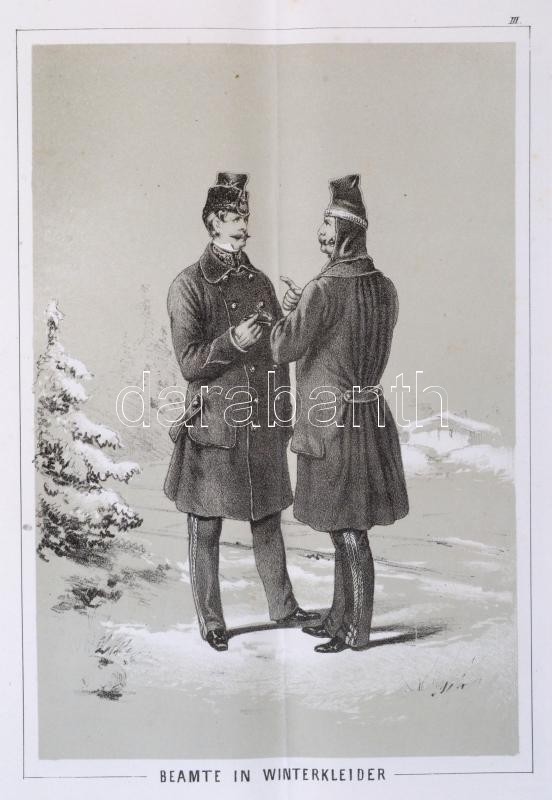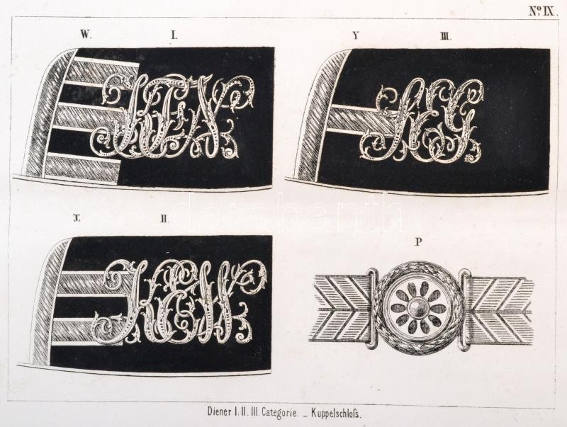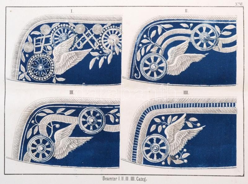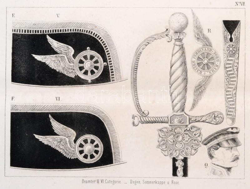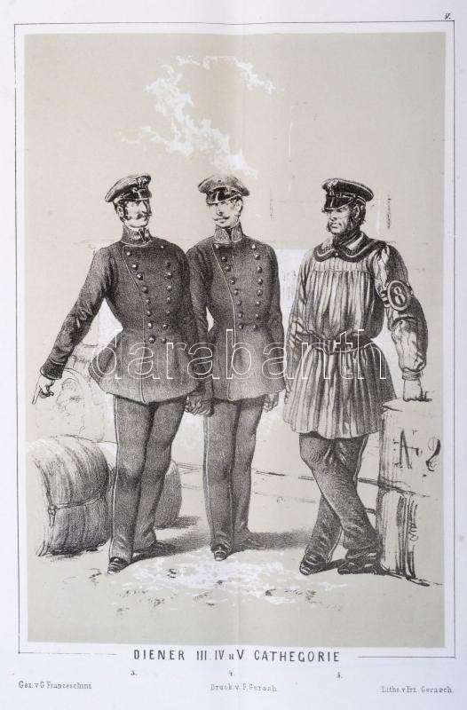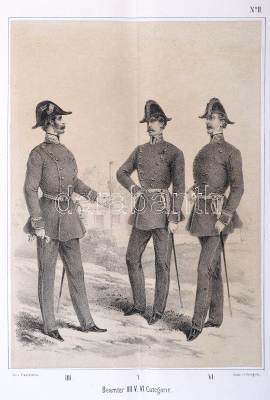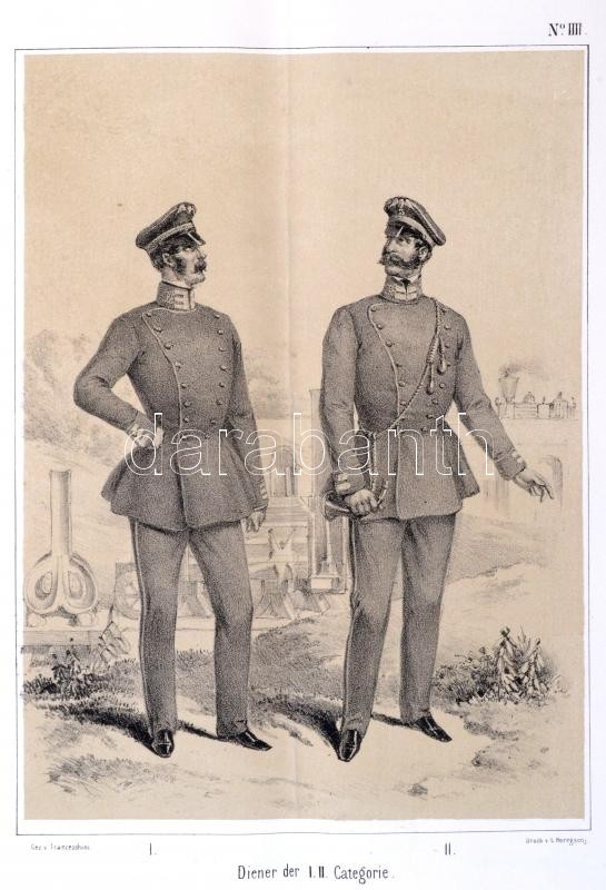 cca 1860 Vasutas egyenruhák bemutatása. 9 db kőnyomatos tábla Zeichnungen zur vorschrift über die Uniformierung der Beamten und Diener der k.k. Staats und Privat Eisenbahnen. Entworfen u. gezeichnet von Cerolamo Francheschini Costume-Director der k.k. Hoftheater. Vasutas egyenruhák bemutatása. 9 db kőnyomatos tábla. Középen hajtásnyommal. / Railway officers uniforms 9 lithographic tables. With mark of folding. 25x33 cm