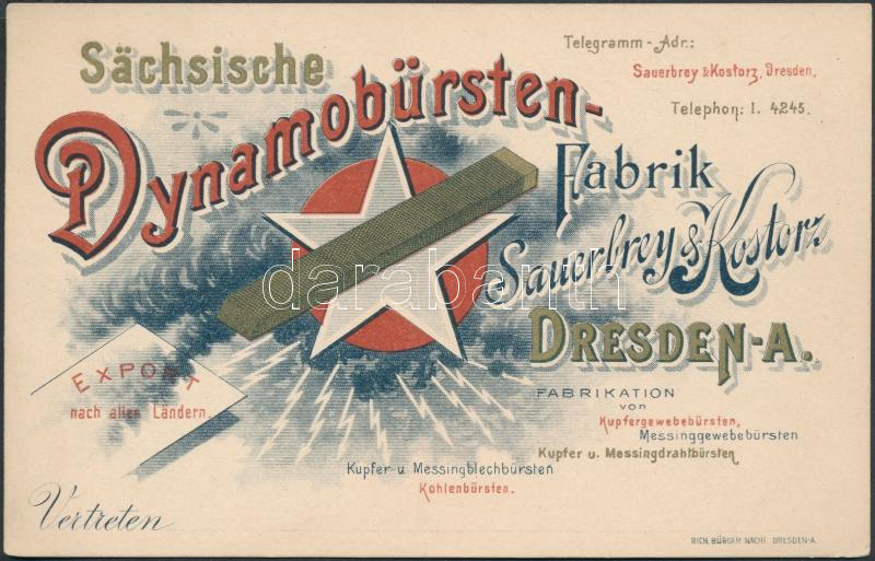 Beschreibung: cca 1900 (elektr. motor- és dinamó-) Szénkefe-gyár litho reklámkártyája / Sächsische Dynamobürsten-Fabrik Sauerbrey-Kostorz Dresden, litho advertising 15x10 cm