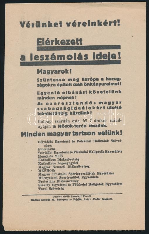 cca 1920 "Vérünket véreinkért! Elérkezett a leszámolás ideje!&quo... https://www.darabanth.com/de/306-Fernauktion/306.0/Andere-Sammelgebiete/Drucksachen~100030/cca-1920-Verunket-vereinkert-Elerkezett-a-leszamolas-ideje-irredenta-roplap~II1570561