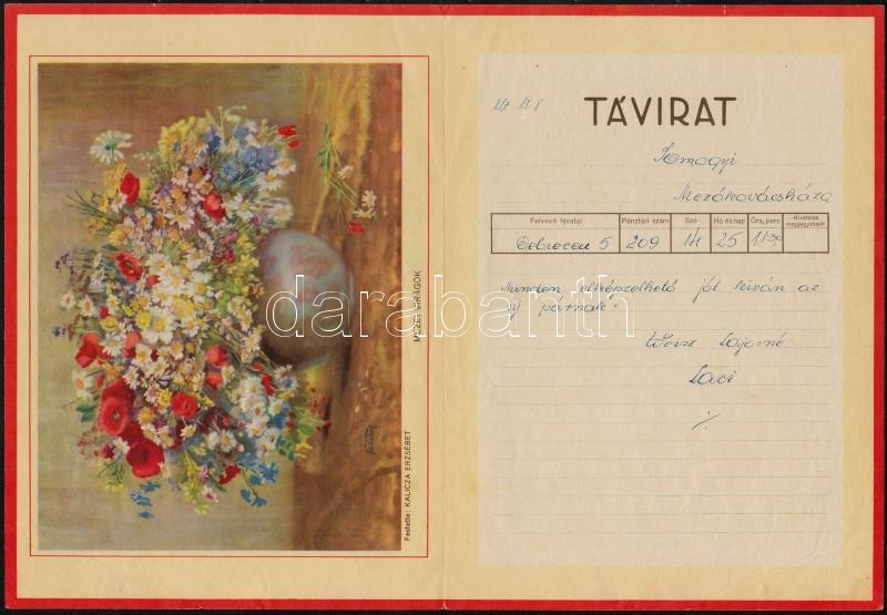 cca 1930 Magyar Királyi Posta díszes távirat, Kalicza Erzsébet Rózsák ... https://www.darabanth.com/de/306-Fernauktion/306.0/Andere-Sammelgebiete/Drucksachen~100030/cca-1930-Magyar-Kiralyi-Posta-diszes-tavirat-Kalicza-Erzsebet-Rozsak-cimu-kepevel-25x18-~II1644002