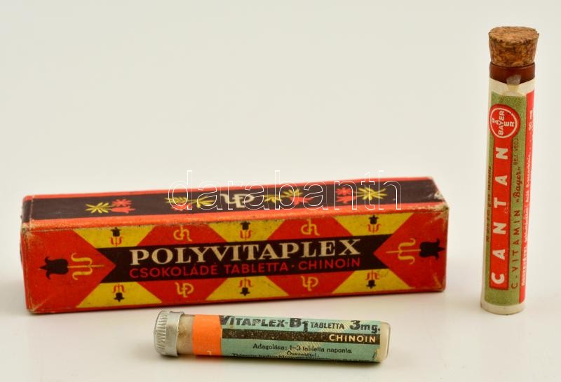 Beschreibung: 2 db régi gyógyszeres üvegcse tartalommal: Cantan c-vitamin, Vitaplex B1 tabletta, Chinoin Polyvitaplex csokoládé tabletta dobozban