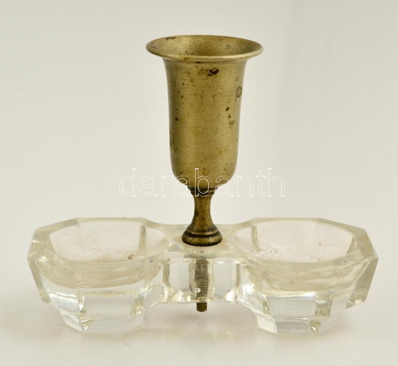 Beschreibung: Csiszolt üveg sótartó Bachmann alpakka fogvájó tartóval, jelzett, kis lepattanással, m: 9 cm